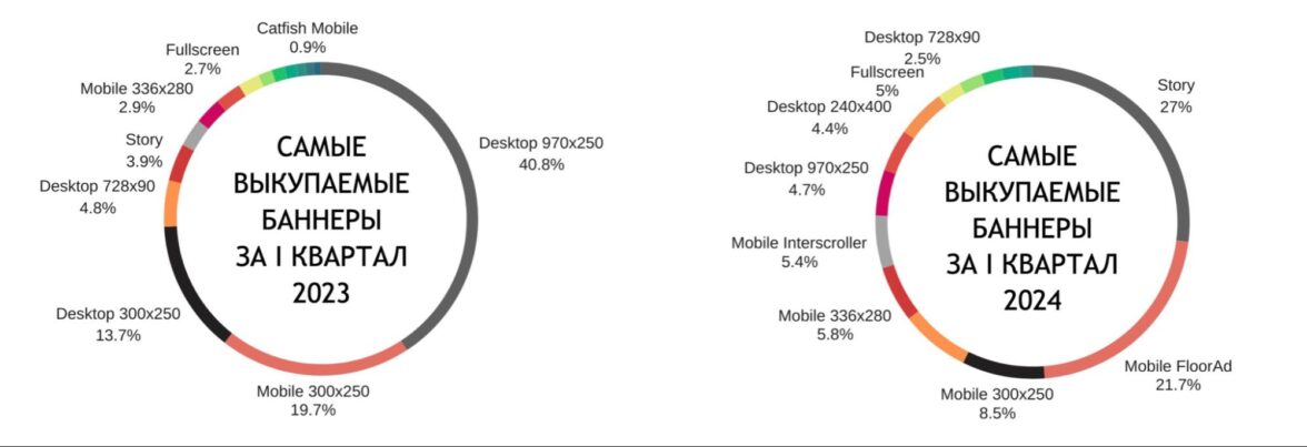 За январь — март 2024 года выкуп по форматам рекламы распределился следующим образом: 27% — Story, 21,7% — Mobile Floorad, 8,5% — Mobile 300×250, 5,8% — Mobile 336×280, 5,4% — Mobile Interscroller. Мобильная реклама становится неотъемлемой частью медиамикса компаний. Для сравнения: в 2023 году в тот же период 40,8% выкупа приходилось на рекламу Desktop. Таким образом можно констатировать расширение спроса на мобильный контент и, как следствие, увеличение интереса рекламодателей к мобильной рекламе.