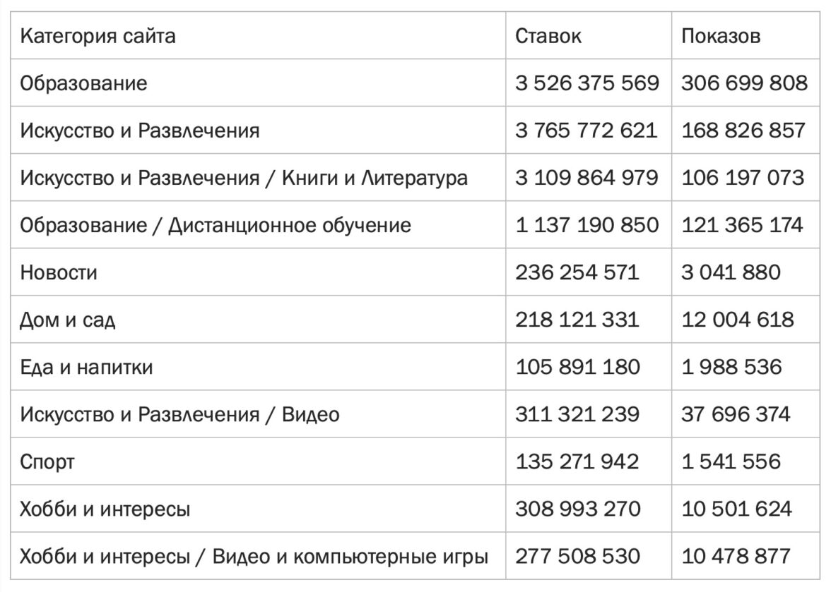 Аудиокниги составляют в нашей классификации часть категорий «Образование и Книги и Литература», поэтому цифры схожи со статистикой Digital Caramel — мы выкупаем у них приличную часть такого инвентаря. Правда новостные сайты составляют не очень большую долю в нашем сплите, иногда универсальный трафик менее хорош чем тематический. Плавно растут запросы на категорию Компьютерные игры как на активную и платежеспособную молодую аудиторию, которая в будущем станет еще более платежеспособной.