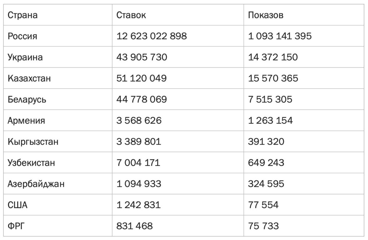 Из нашей таблицы видно, что наши рекламодатели в рамках трафика партнера тоже сфокусированы на ГЕО РФ, а СНГ мы разбили на отдельные государства: в топе СНГ и бывших стран СНГ — Украина, Казахстан и Беларусь (причем показов рекламы больше именно в Казахстане). Европейские страны попадут в топ-10 только при объединении их данных.