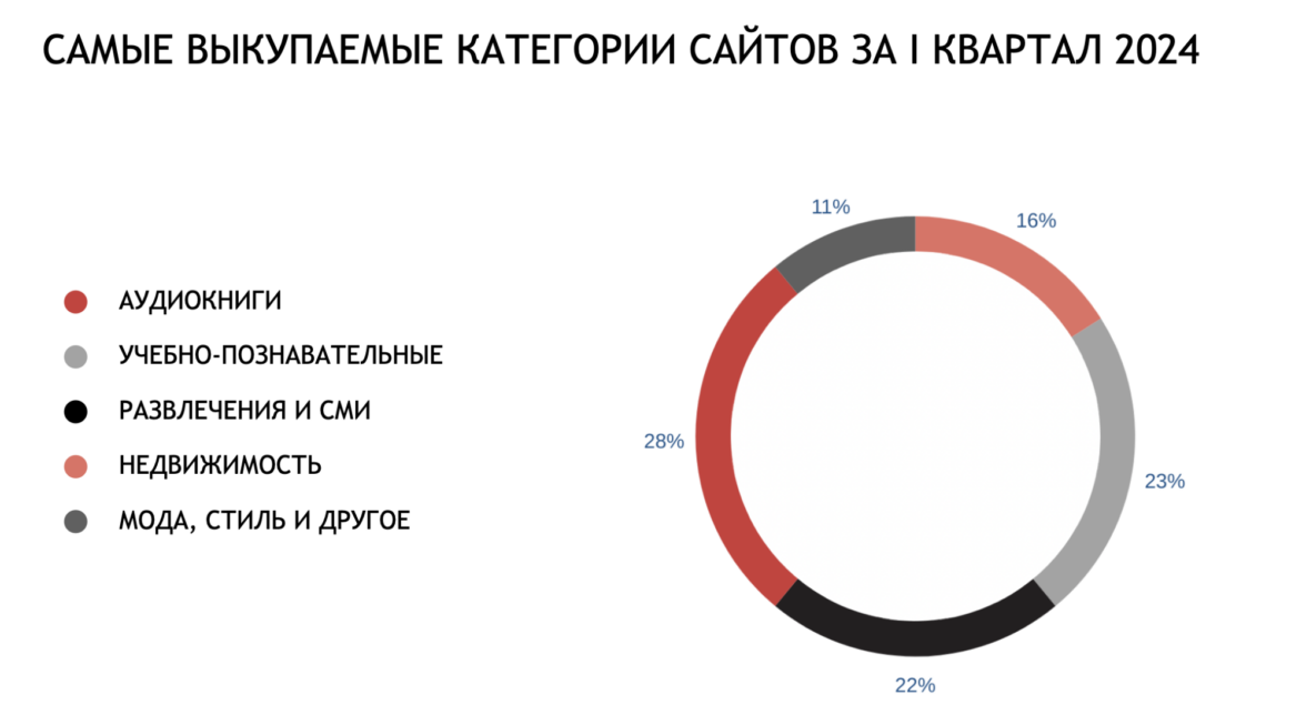 Выкуп трафика сайтов в зависимости от их категории и тематики выглядит стабильно, здесь нет кардинальных изменений в сравнении с прошлым годом. Лидируют учебно-познавательные площадки (23%), ресурсы с книгами и аудиокнигами (28%), СМИ (22%). Связано это с временем, которое читатели проводят на сайте. Лонгриды, ресурсы, где пользователи могут скроллить информацию и проводить большее количество времени, как правило, приносят больший доход.