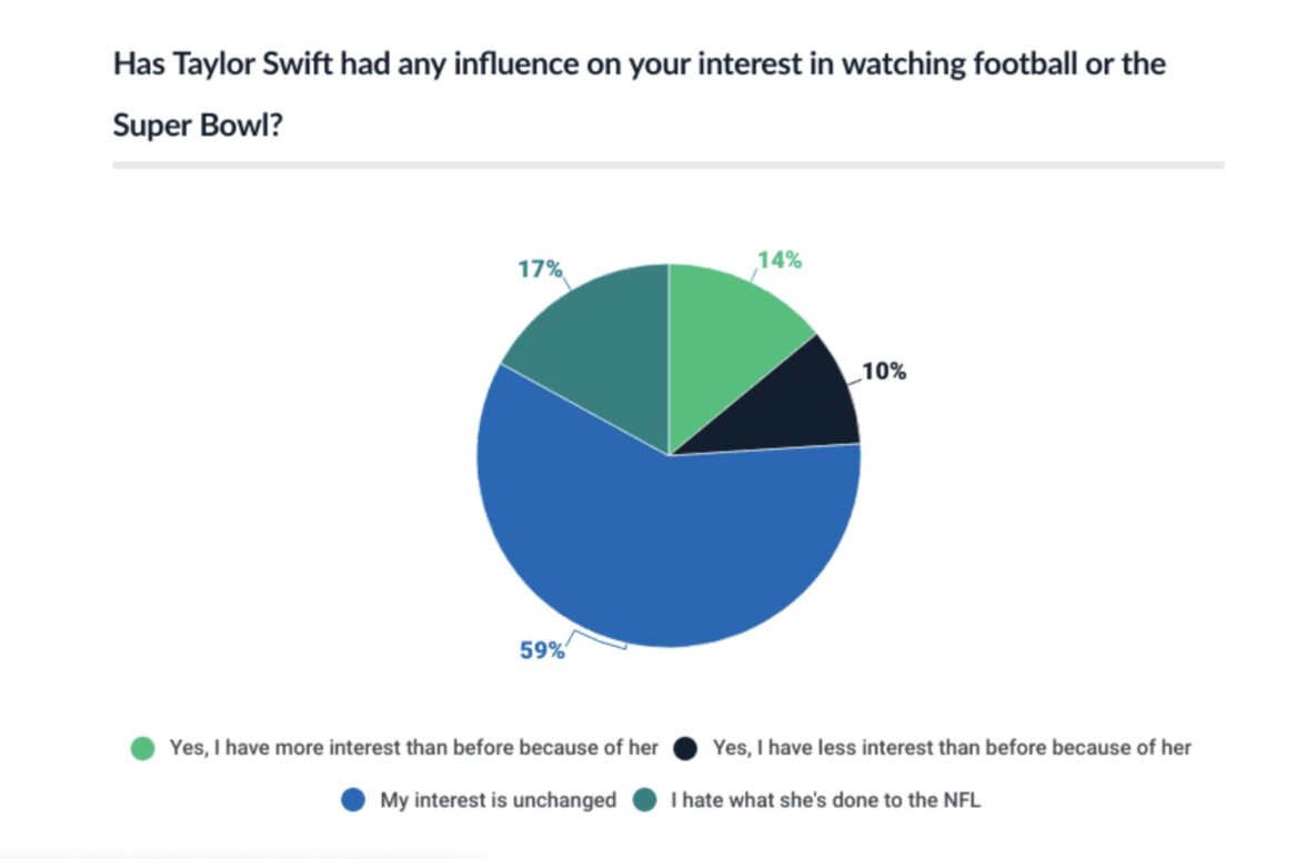 Роман певицы Тэйлор Свифт и игрока в американский футбол Трэвиса Келси по-разному воспринимается американцами. Келси играет за «Канзас-Сити Чифс», эта команда в прошлом году выиграла Super Bowl, а в этом году опять участвует в финальной игре сезона. Из-за этого романа 14% участников опроса стали больше интересоваться американским футболом, а 10%, наоборот, меньше. Притом и заинтересовавшихся, и разочаровавшихся больше всего среди представителей поколения Z. А 17% опрошенных согласились с утверждением: «Я ненавижу то, что она сделала с НФЛ». На отношение 59% респондентов к американскому футболу Тэйлор Свифт не повлияла.