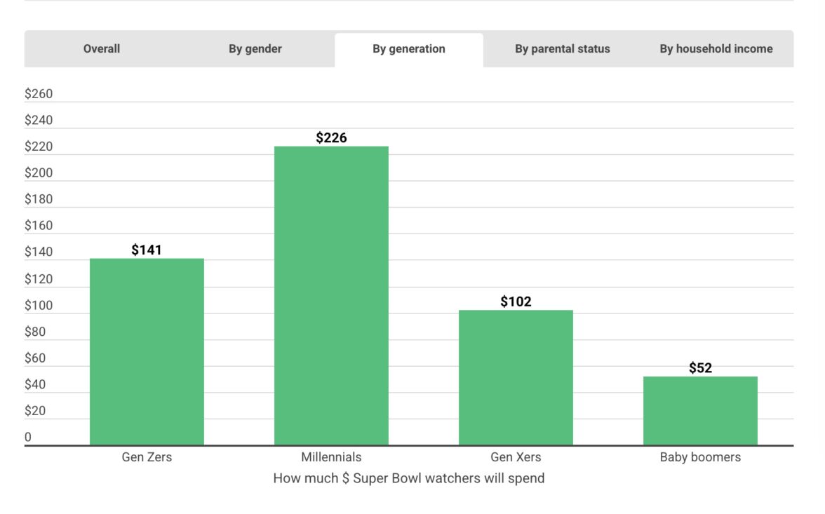 Средний уровень расходов сильно зависит от того, к какому поколению принадлежит болельщик. Самые старшие, бэби-бумеры потратят на домашний спортивный праздник в среднем $52, меньше всех. Миллениалы — $226, больше всех. Зумеры — $141. Представители поколения Х — $102. (Как исследователи определяли поколения — см. в справке).