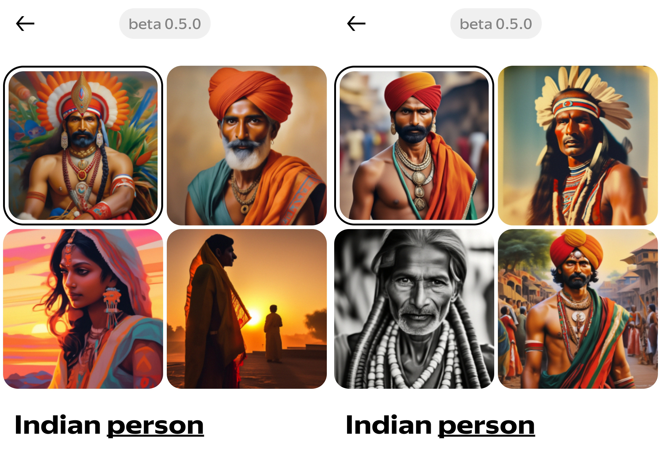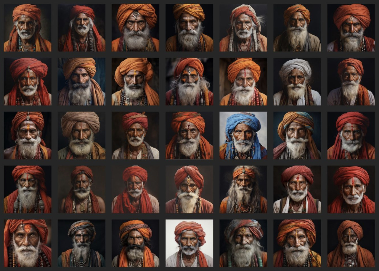 Из сотни индийцев, чьи портреты сгенерировала Midjourney, 99 оказались мужчинами, почти все с сединой и морщинами — явно старше 60. При этом на самом деле медианный возраст жители Индии — 28,7 лет, четверть населения — моложе 14 лет, а доля людей старше 65 меньше 7%. Подавляющее большинство «нейросетевых индийцев» имели те или иные признаки, идентифицирующие их как индуистов, при том, что в стране живут миллионы мусульман (14% от населения почти в полтора миллиарда человек), христиан и представителей других мировых религий.