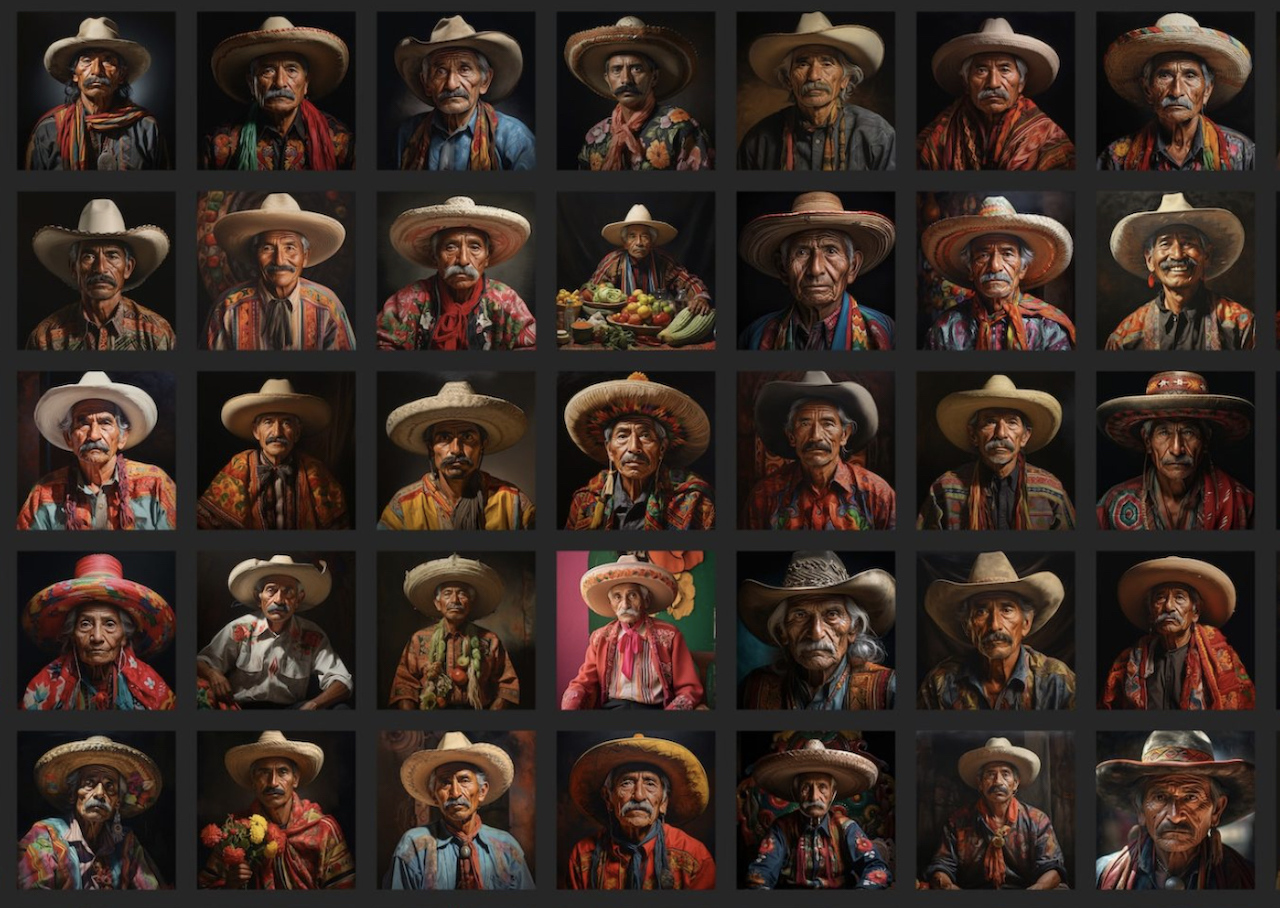Нейросеть одела в традиционные наряды и мексиканцев: почти все оказались в сомбреро. Большинство реальных мексиканцев, индийцев или нигерийцев сейчас носят то же самое, что и люди на Западе — футболки и джинсы, а самый распространенный головной убор — бейсболка.