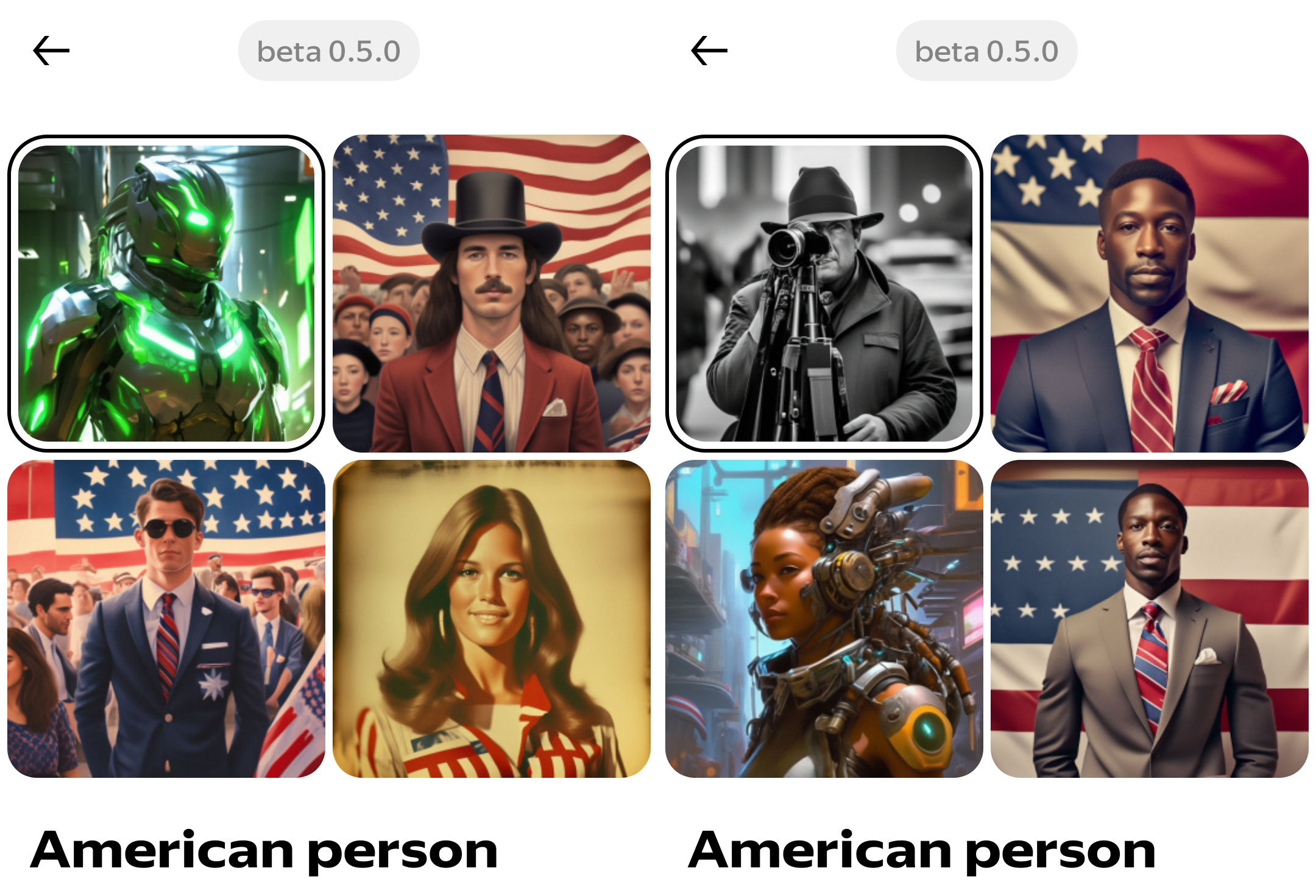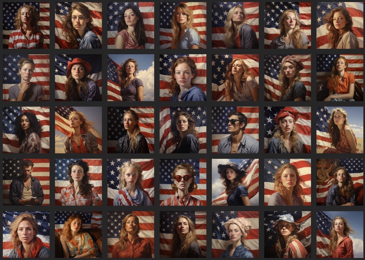 Такой же подход, впрочем, искусственный интеллект использует и к «рисованию» американцев: все 100 сгенерированных по запросу «American person» портретов так или иначе используют звездно-полосатый флаг. Даже этот, хотя, определенно, заслуживает приз за оригинальность: