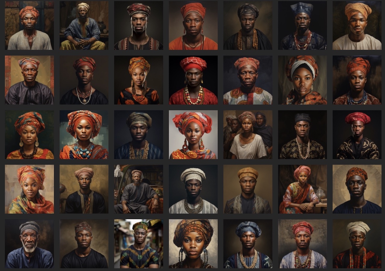 Например, около половины населения Нигерии — мусульмане, исповедующие ислам женщины носят хиджаб, однако Midjourney явно не в курсе. Не знает нейросеть и об особенностях одежды различных этнических групп, которых в стране сотни, смешивая характерные признаки, приводя к единому знаменателю. Да и разнообразие оттенков кожи у настоящих нигерийцев гораздо больше, чем показывает нейросеть. Но не знающий об этом человек из западной страны не заметит искажения. Повязка на голове, сочетание красного, желтого и оранжевого, массивные серьги и ожерелья, низкие прямые шапочки у мужчин: для зрителя, знакомого с культурой Нигерии лишь поверхностно, все это покажется вполне убедительным.