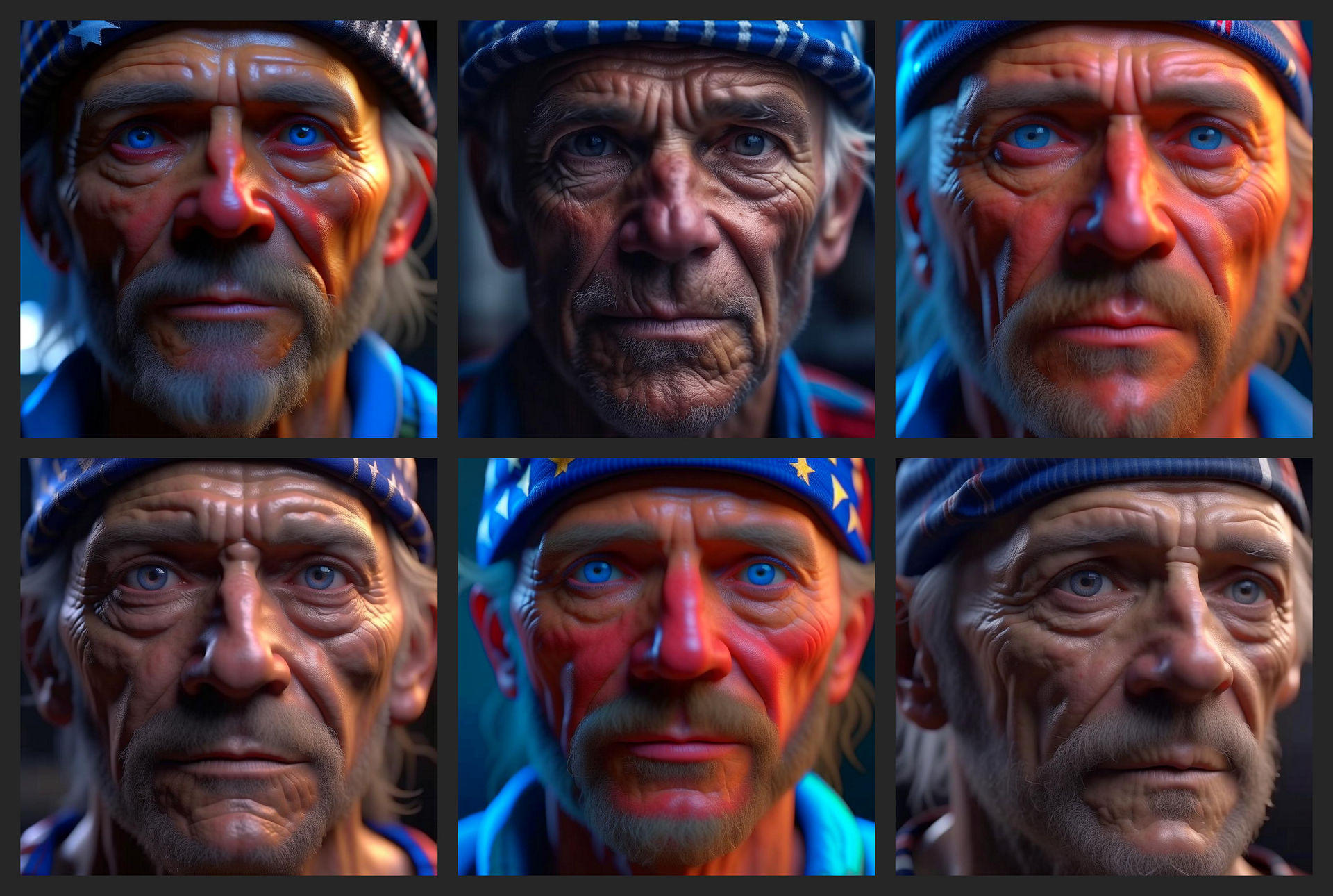 Что касается «American person», в целом выдача тоже более разнообразна демографически, чем у Midjourney. Некоторые портреты указывают, что, по версии нейросети «Яндекса», американцы уже живут в обществе победившего киберпанка. Остальные изображения – скорее карикатуры, стоковые фото ими точно не заменишь.