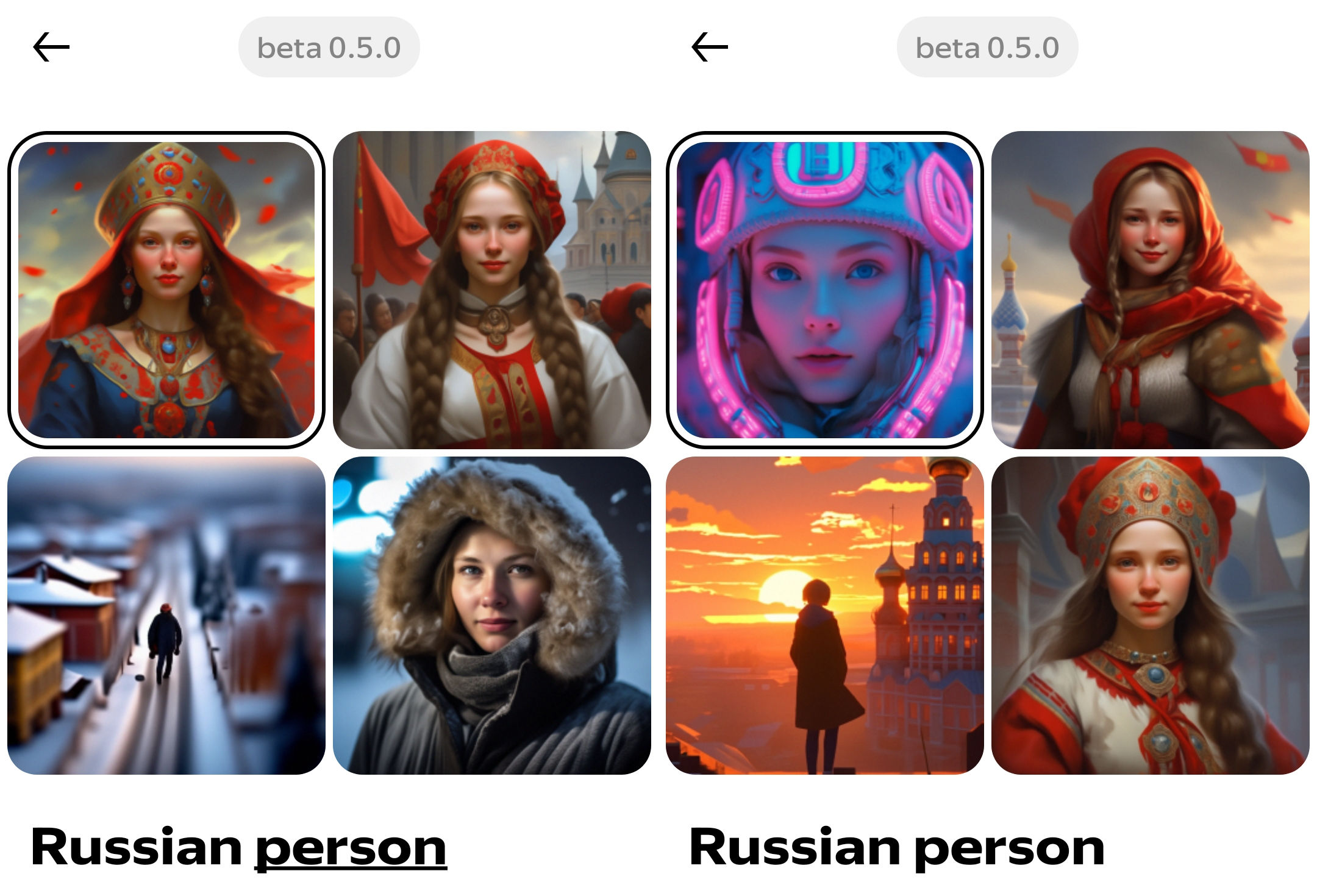 Нейросеть «Яндекса» подходит к задаче куда более смело и творчески. Хотя без стереотипов не обошлось: из восьми вариантов, сгенерированных «Шедеврумом» по запросу «Russian person» в две итерации, четыре картинки изображают красных (в прямом смысле) девиц в национальных нарядах, две — абстрактно-поэтичные, одна футуристичная и одна (девушка в зимней куртке) по-хорошему реалистичная. Ее действительно можно было бы без проблем использовать в дизайне лендинга или маркетинговой брошюры. Удивительно, что ни на одной из картинок нет мужчин.