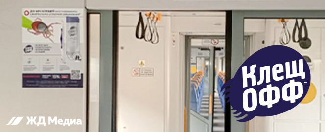 Масштабная рекламная кампания бренда «КлещОФФ» в пригородных электропоездах России.
