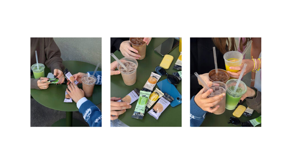 Для каждого из четырех вкусов подобрали оттенки, которые интуитивно понятны и отражают его суть. Матча: свежий зеленый, куркума: сочный солнечно-желтый, латте: нежный бежевый, цикорий: умиротворяющий сине-сиреневый, как цветок цикория.