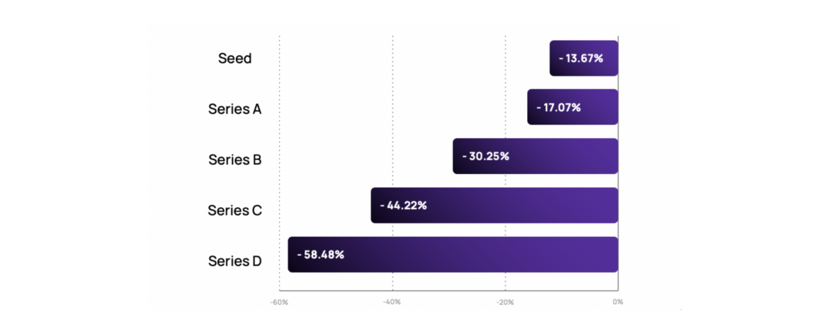• За последний год произошло заметное снижение показателя медианных оценок pre-money valuations, особенно в инвестициях на поздних стадиях.