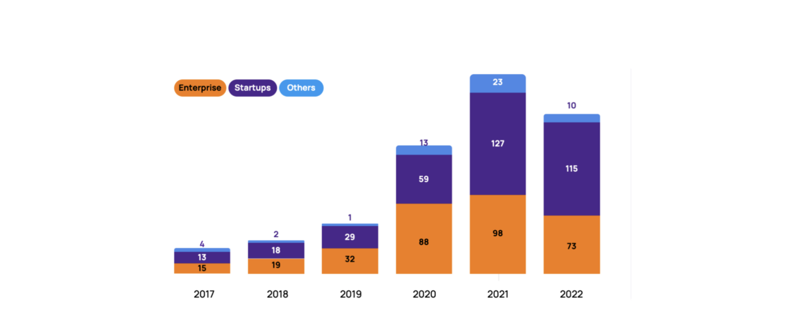 • Начиная с 2014 года, количество регистрируемых стартапов год от года росло, и этот процесс замедлился лишь недавно — в 2022 году.