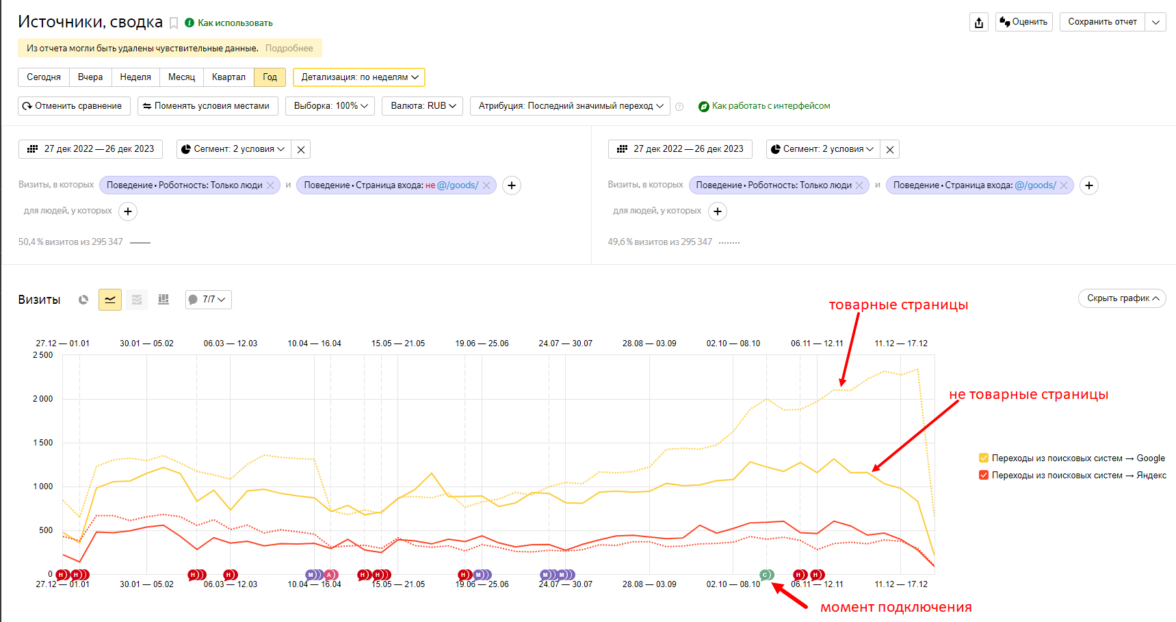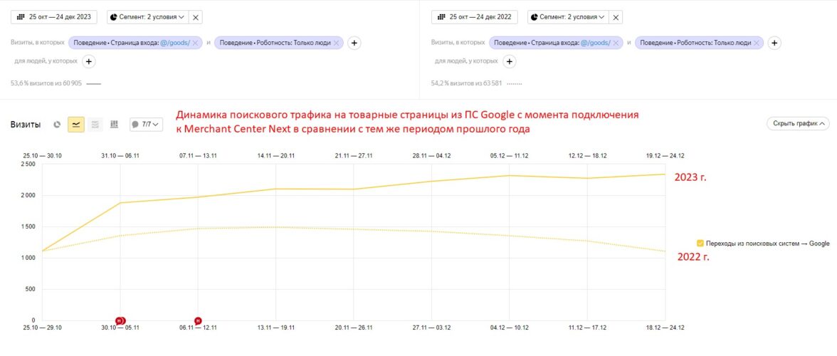 Это видно и по сравнению динамики трафика на товарные страницы за 2022 и 2023 год. В 2022 году сайт не был подключен к Merchant Center: трафик из Google на товарные страницы оставался примерно на одном уровне, а к концу года начал стагнировать.