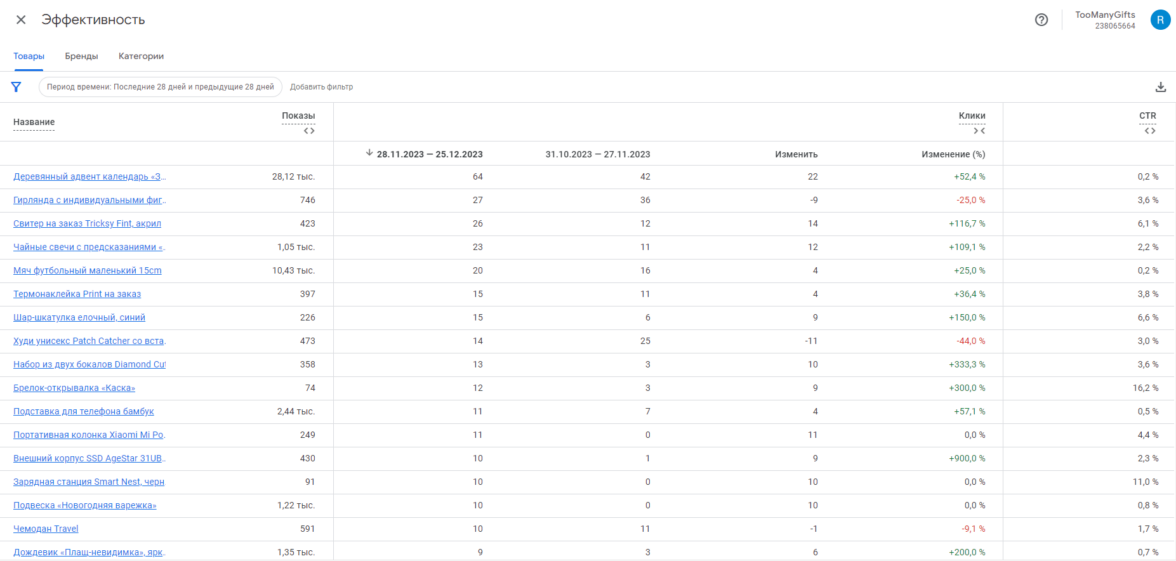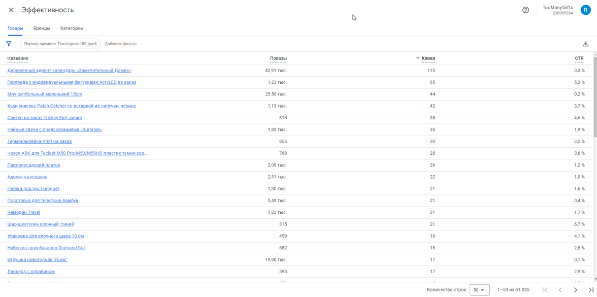 В Merchant Center Next много интересной для маркетологов и SEO-специалистов информации. Например, данные о востребованности отдельных товаров, брендов и целых категорий товаров.