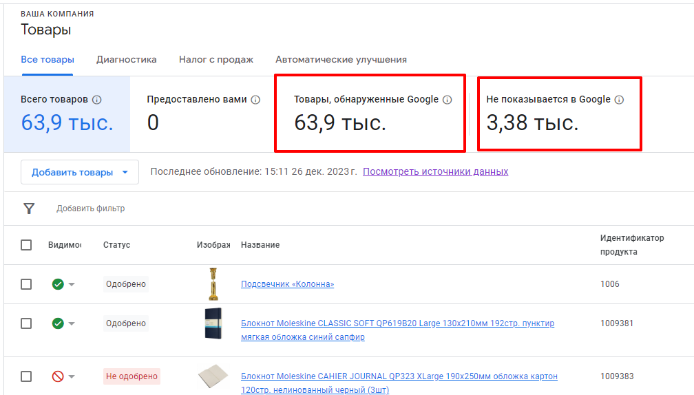 У нас проблем с сервисом не возникло: 86% от всех товаров нашего сайта сразу прошли проверку. Могло бы быть 90%, но часть товаров Google все-таки забраковал из-за несоответствия требованиям. Например, у части товаров не было цены, поскольку многие позиции доступны только под заказ — для них стоимость нужно рассчитывать индивидуально.