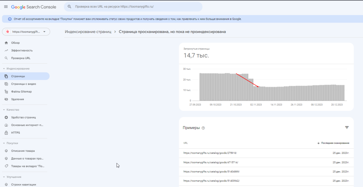 По данным Google Search Console, количество просканированных, но непроиндексированных страниц уменьшилось после подключения к сервису почти в два раза: с 25 тысяч до 13 тысяч.