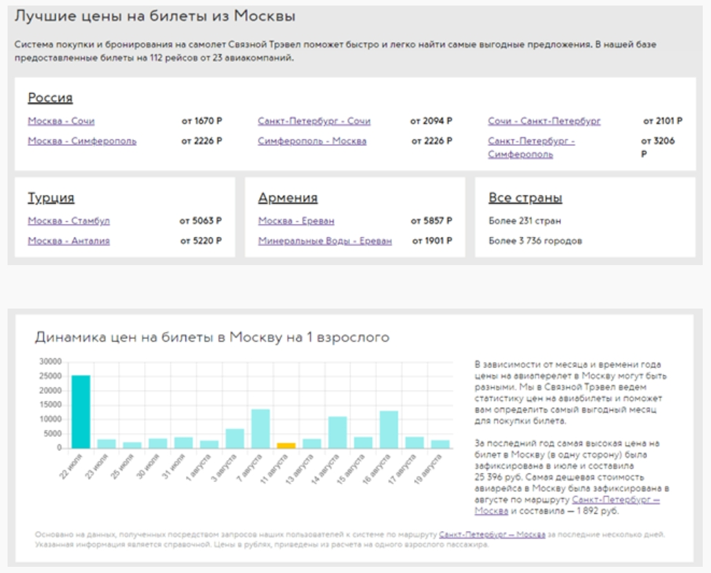 Вначале доработали страницы со списком стран городов и авиакомпаний. Создали новый список по направлениям. Настроили перелинковку между страницами так, чтобы переход с одной страницы на другую был удобным как для пользователей, так и для поисковиков. Это улучшило индексацию.