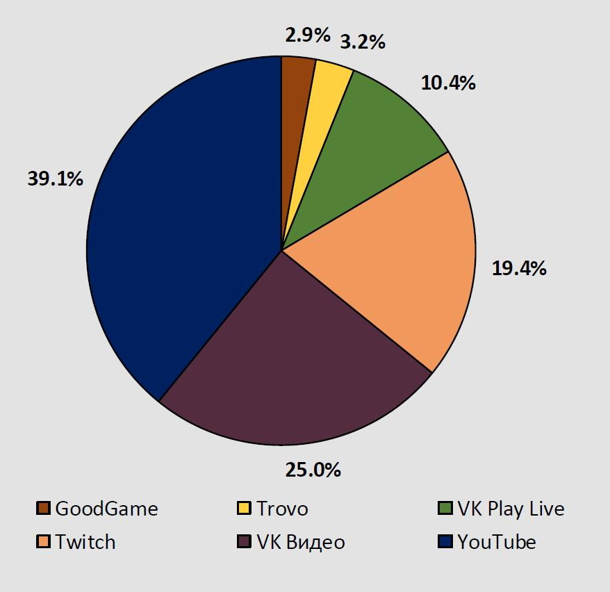 Что касается стриминга игр, то лидером предпочтений участников исследования с 39,1% голосов стал YouTube, на втором месте «VK Видео» (25%0, а на третьем — главный мировой игровой стриминговый сервис Twitch (19,4%).
