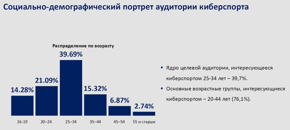 Согласно исследованию, киберспортом интересуется чуть меньше трети (28,9%) россиян. Ожидаемо, мужчины увлекаются киберспортом больше, чем женщины (соотношение составляет 61,9% к 38,1% респондентов). Самый большой интерес киберспорт вызывает у россиян в возрасте от 16 до 34 лет — 75,03% респондентов. При этом пик интереса приходится на людей постарше — в возрасте от 25 до 34 лет (39,69% участников исследования). Минимальный интерес данная спортивная дисциплина вызывает у людей старше 55 лет (2,74%).