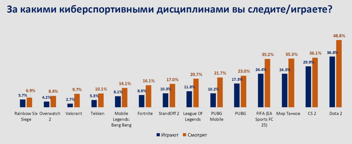 Самая популярная киберспортивная игра у участников исследования — многопользовательская арена Dota 2. В нее играют 36,85% респондентов, а трансляции смотрят 48,8%, на втором месте шутер Counter Strike 2 — 29,9% и 36,1% соответственно. На третьем — танковый симулятор «Мир танков» (24,3% и 35,3%). На другом конце рейтинга также расположились шутеры разного стиля Rainbow Six Siege, Overwatch 2 и Valorant.