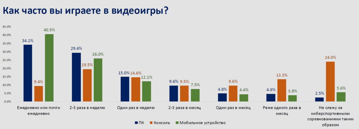 Основной игровой платформой для участников опроса стали смартфоны: 40,5% играют на них ежедневно, а 26% — два-три раза в неделю. Любопытно, что чем реже играют респонденты, тем чаще они используют для развлечения компьютеры или консоль. Исследователи не объясняют, почему так происходит, но можно с большой долей уверенности предположить, что популярность мобильных игр связана с низким ценовым порогом входа.