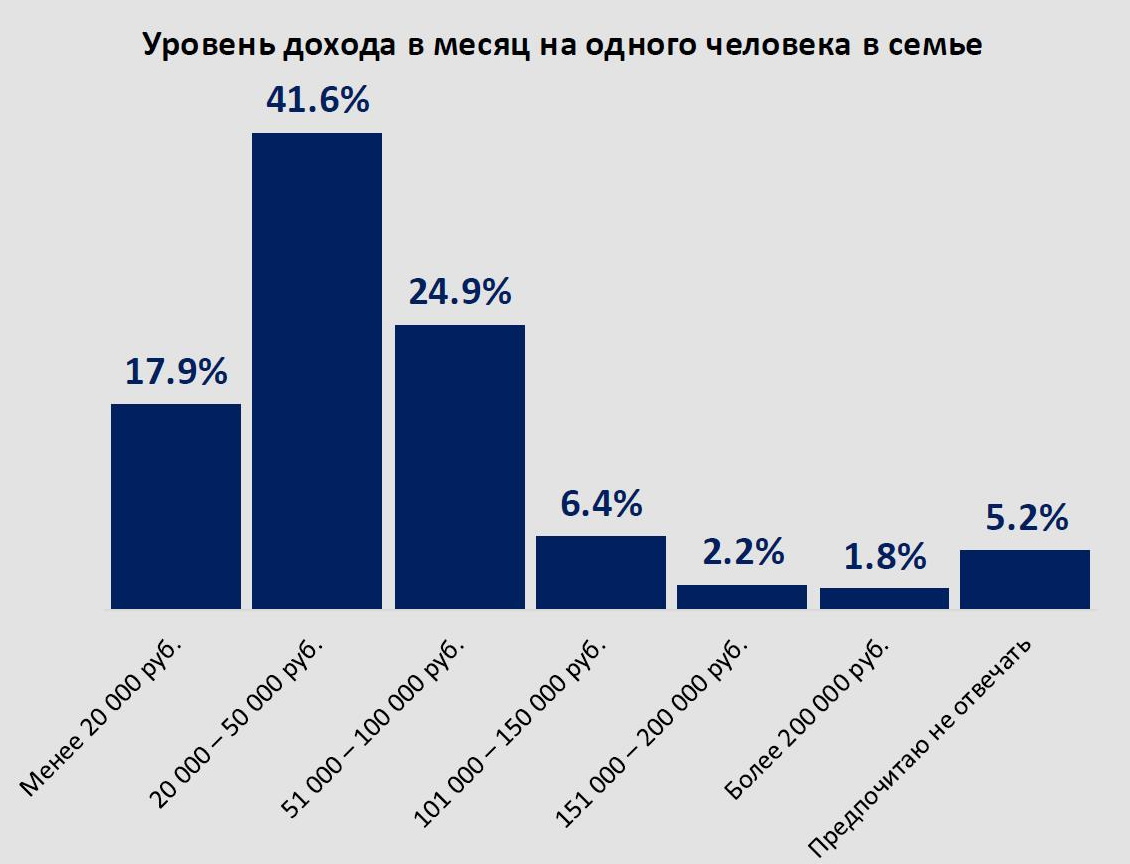 Интересно, что самый большой сегмент совершающих покупки в играх (41,6% респондентов) имеют ежемесячный доход на одного члена семьи от 20 до 50 тыс. рублей. Те, кто тратят в играх до 1 тыс. рублей (17,9%) в месяц, имеют доход на каждого члена семьи меньше 20 тыс. рублей.