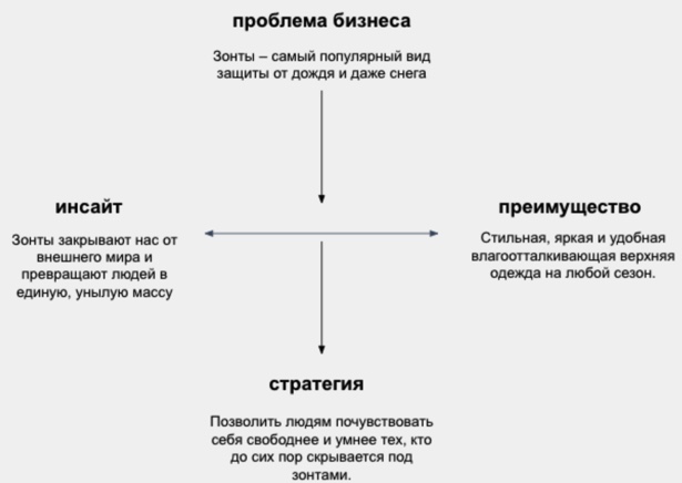 Бренд-стратегия или позиционирование бренда — рассказывает о том, кто мы, как мы отвечаем на боли и инсайты аудитории, чем отличаемся от конкурентов и почему надо купить именно наш дождевик. Проведя анализ и нащупав инсайт аудитории, мы формулируем емкое позиционирование. Например: бренд одежды для тех, кто выходит сухим из воды.
