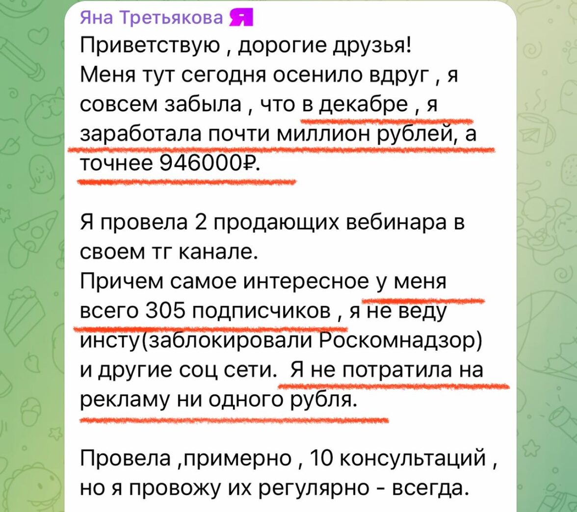 Фишки, секреты, тренды из сказки про миллионы. Многие люди бегают по курсам и ищут фишку, новый способ, секретный секрет. Если ты в минусе или не вышел на стабильно высокий доход, покрывающий твою «стоимость жизни», нужно искать не фишки и секретики, не искусственный интеллект, а решить базовые фундаментальные вопросы — правильная конфигурация продукта, элементарная модель продвижения, исполнение обязательств, навык доводить до конца, навык получать обратную связь от рынка и изменять под неё свой бизнес, навык доносить ценность, навык не отваливаться половине пути и ещё много чего.