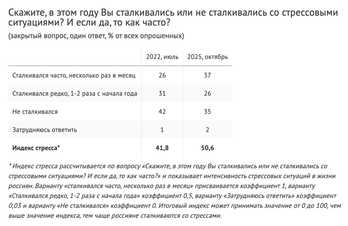 Согласно опросу ВЦИОМ, почти четверо из десяти (37%) россиян в этом году часто, несколько раз в месяц, сталкивались со стрессовыми ситуациями. В июле 2022 года о таком заявлял лишь каждый четвертый (26%). Каждый четвертый (26%) в 2025 году сталкивался со стрессом, но реже, 1–2 раза с начала года. В 2022 году редко испытывавших стресс было немного больше — 31%. В общей сложности в 2025 году испытывали стресс 63% опрошенных (против 57% в 2022 году). Вообще не сталкивавшихся за год со стрессом в 2025 году было 35%, в 2022 году — 42%. Определяемый ВЦИОМом индекс стресса сейчас составляет 50,6%, в июле 2022 года он составлял 41,8%.