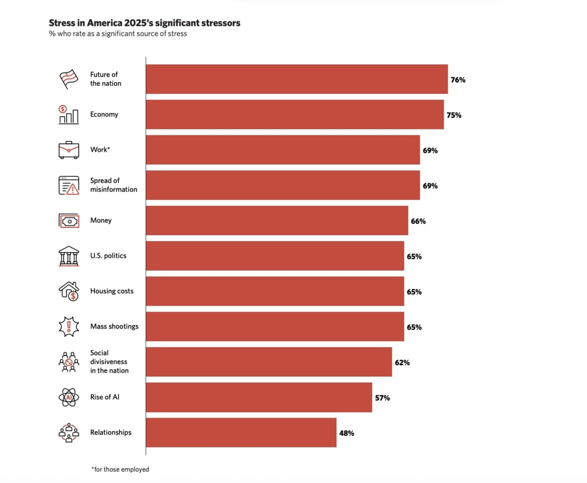 Опрос, проведенный Harris Poll по заказу APA, показал, что для трех четвертей (76%) американцев значительным источником стресса являются мысли о будущем страны. Практически столько же опрошенных заявили о том, что на стресс влияет ситуация в экономике. Почти семь из десяти работающих (69%) назвали стресс, связанный с работой, серьезной проблемой. Это самый высокий показатель, зафиксированный со времен пандемии COVID-19. Столько же респондентов назвали источником стресса дезинформацию. 66% назвали стрессором деньги, по 65% — политику США, стоимость жилья и массовую стрельбу. Две трети (62%) американцев назвали социальное разобщение значительным источником стресса в своей жизни. Для 57% фактором стресса является развитие ИИ. У 48% вызывают стресс проблемы в отношениях.