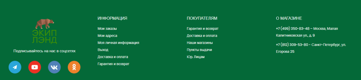Подвал дублирует ссылки на основные разделы каталога, содержит контактные данные и соцсети, а также служебную информацию о политике конфиденциальности и юридических подробностях. Здесь же пользователи ищут условия доставки и возврата товара.