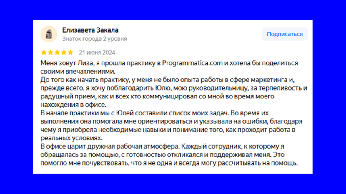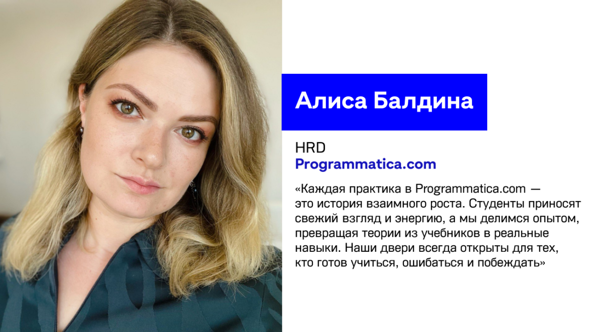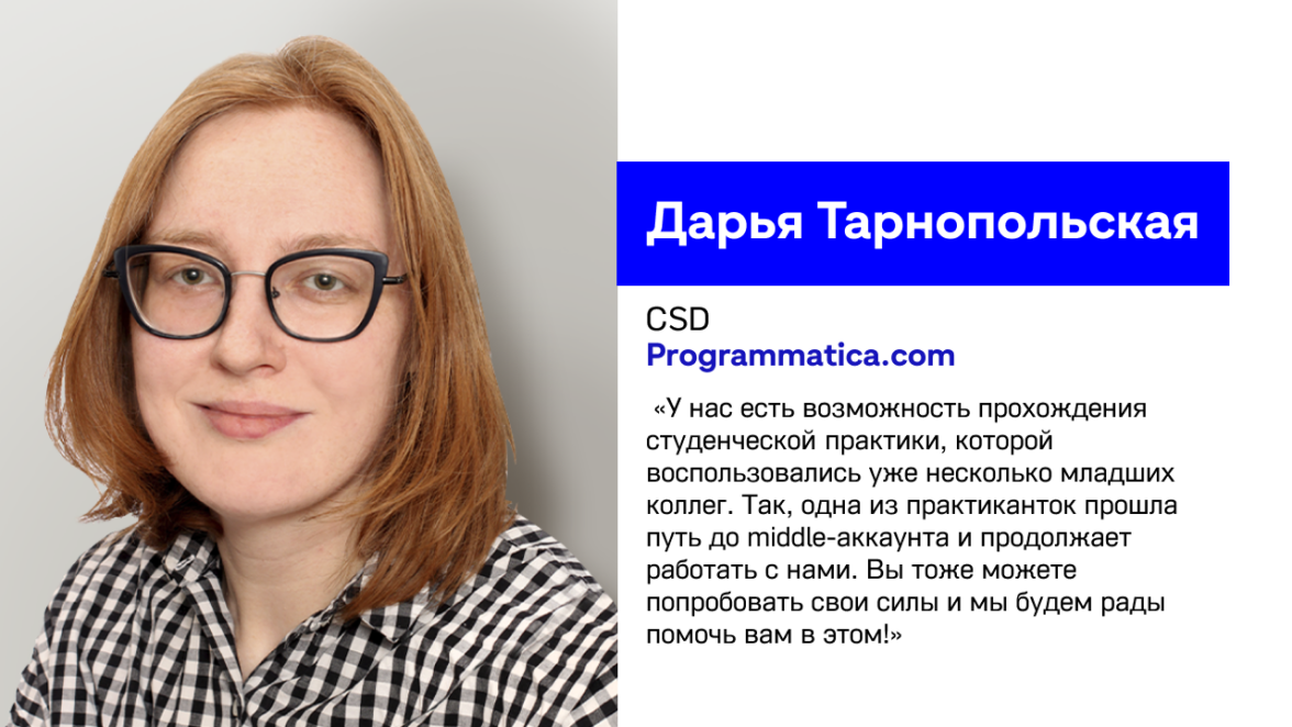 «Это был 2023 год. Я училась в Российском государственном гуманитарном университете (РГГУ). Рассчитывала попасть на практику в PR-отдел, но там уже был, поэтому предложили отдел аккаунтинга. Programmatica.com работает с крупными клиентами, в том числе и зарубежом. Перспектива набраться такого опыта и обрести полезные знакомства вдохновила меня. Так неожиданно и удачно я попала в это направление.