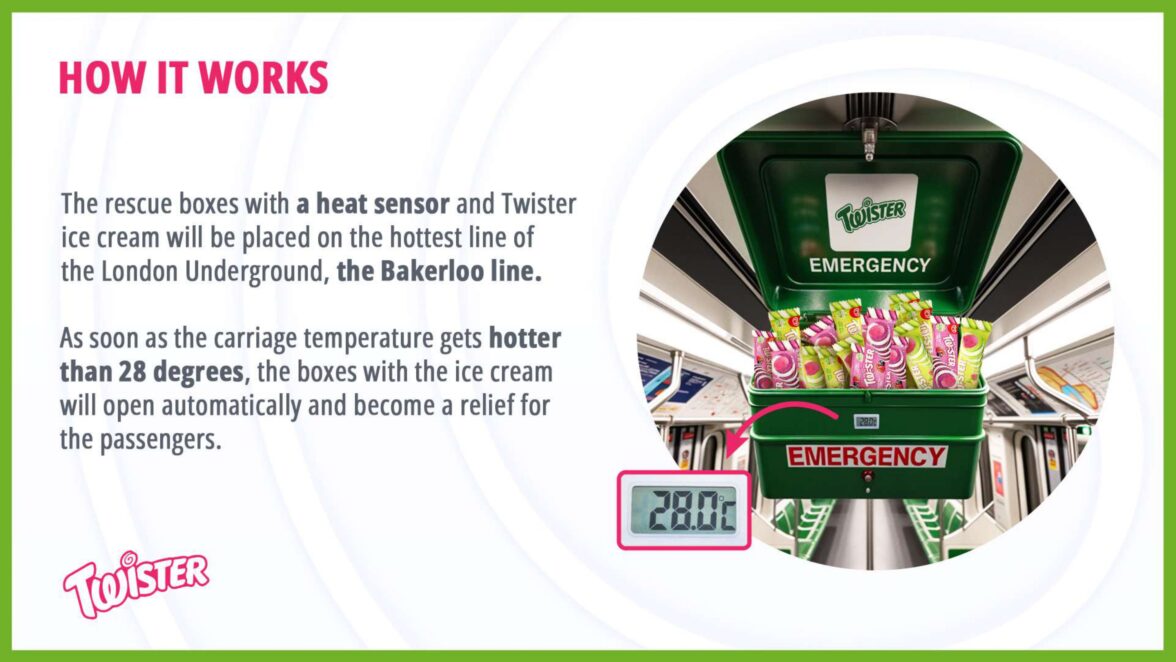 Ныряем в Google, и оказывается, что в лондонском метро проблемы с кондиционированием. В старых вагонах их нет, температура выше чем на улице, летом просто страшно заходить. Люди даже в обморок падают! Поэтому мы решили, что поставим эти emergency box туда. Как только датчики фиксируют температуру в вагоне выше 28. Боксы открываются, и люди могут взять мороженое twister. Не только охлаждение, но то что может принести много ugc и стать виральным.