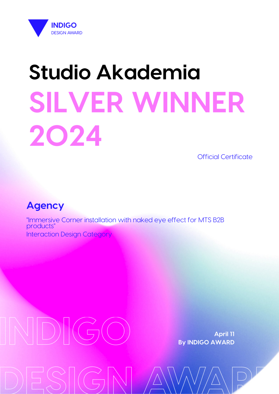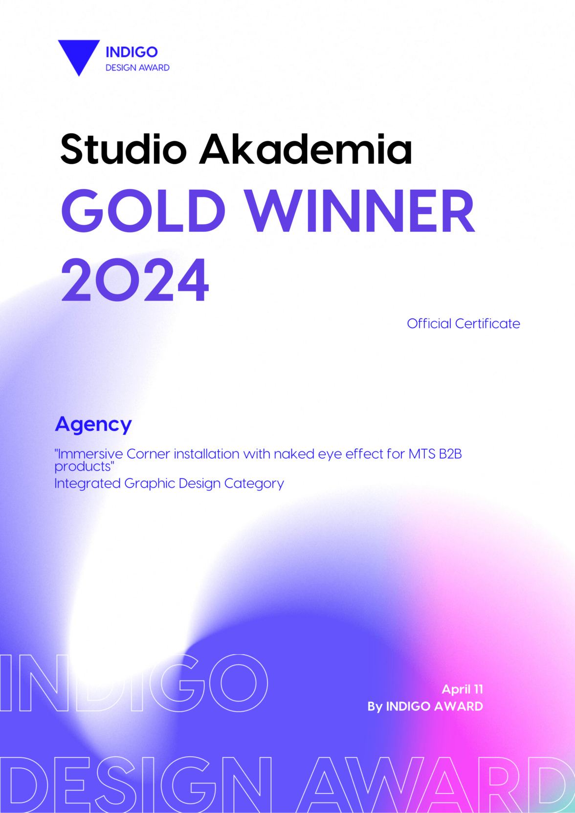 Для масштабного релиза нового фирменного стиля МТС и продуктов экосистемы, студия создала трехмерное пространство с эффектом naked eye и шесть тач-экранов с презентацией продуктов. С помощью применения интерактивных технологий команде удалось повысить уровень восприятия МТС как инновационной и технологической компании за счет нестандартной подачи бренда.Премия INDIGO высоко ценит проекты, в которых присутствует инновационный вклад в мир цифрового дизайна, этим обосновано большое количество наград присужденных студии.