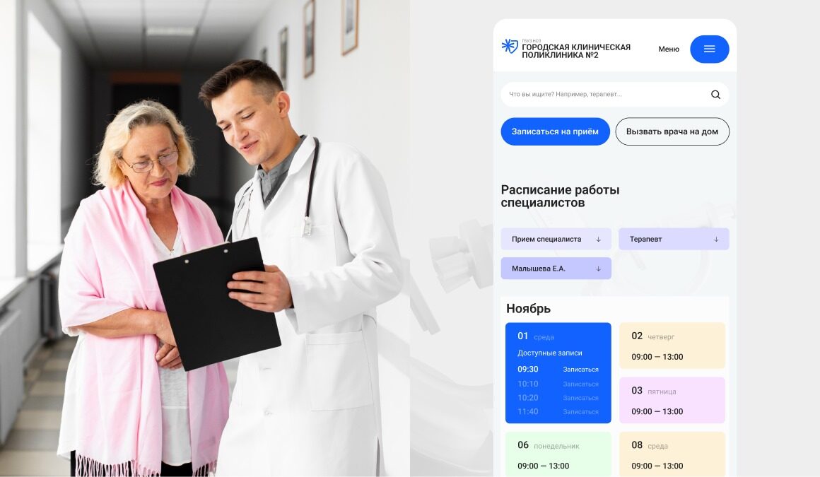 Разработчики студии Евгении Лощиловой создали прототип сайта поликлиники, где есть разделы с информацией о врачах, расписание работы и онлайн запись к врачу. Дизайн сайта государственной поликлиники ни в чем не уступает аналогам частных клиник.
