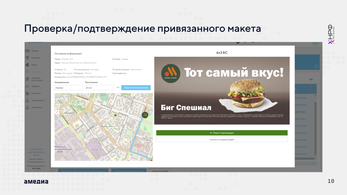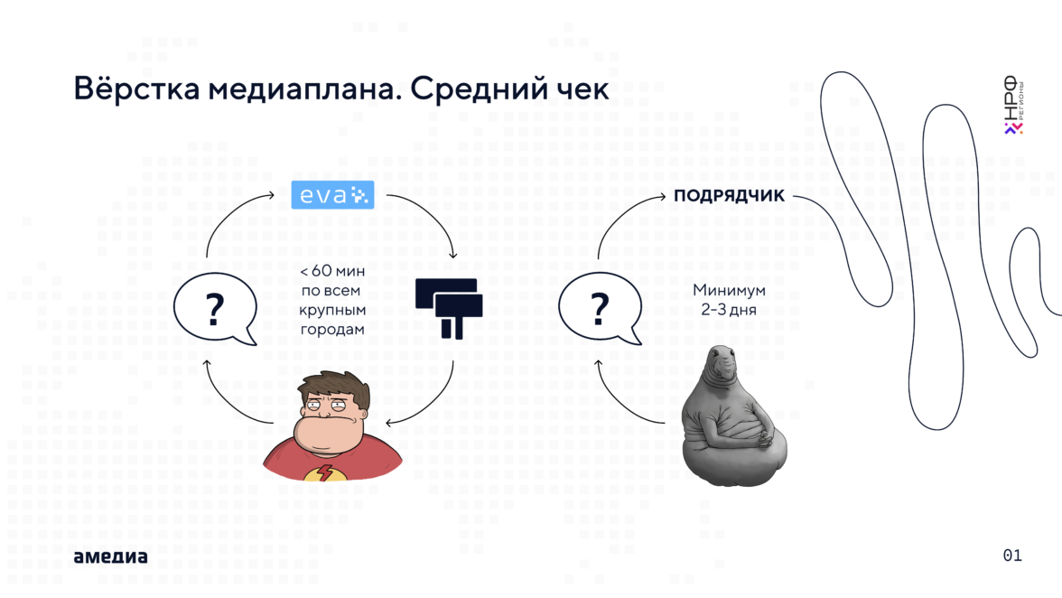 В этом вопросе нам помогает EVA — экосистема для наружной рекламы, которая позволяет оптимизировать работу с рекламными кампаниями. Благодаря подключенным по API крупнейших саплаеров Russ Outdoor (+Gallery), РИМ, Дизайнмастер и другим более мелким операторам, нам удается максимально оперативно собрать средний чек по городам и информацию по доступности инвентаря на месяц, в котором планируется рекламная кампания.