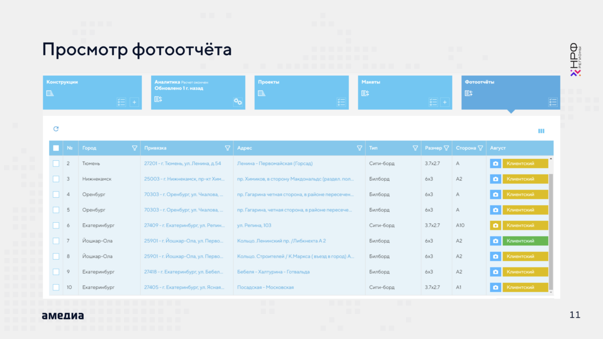 Поэтому здесь мы опять обращаемся к платформе EVA, которая благодаря наличия статусов свободно/занято по инвентарю в 125 городах, позволяет сократить время на сбор адресной программы, для медиаплана клиента хотя-бы по части городов.