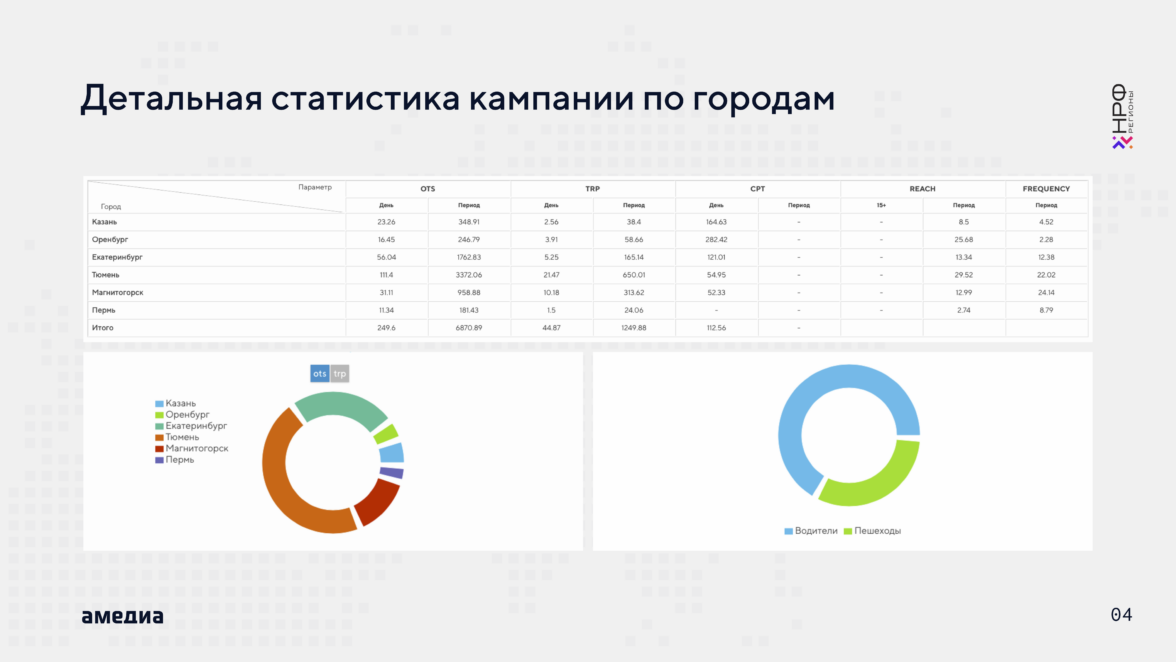 В разделе аналитика доступны данные по охватам в каждом городе, а также другие показатели такие как частота и суммарные данные по OTS. Распределение трафика среди водителей и пешеходов, а также соц. дем. характеристики аудитории.