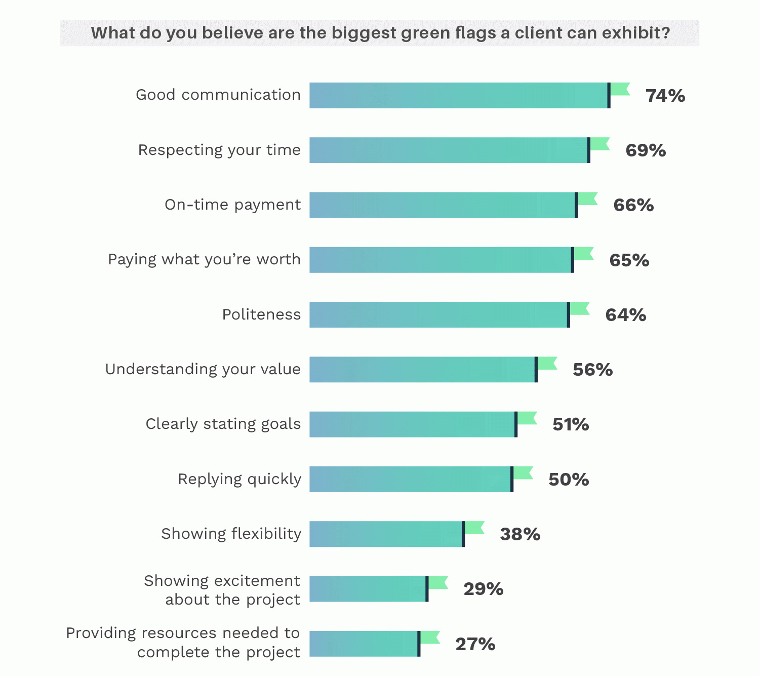 Фрилансеры любят клиентов, с которыми легко договориться, об этом рассказали 74% респондентов. 69% респондентов рассказали, что им нравятся клиенты, ценящие время фрилансера, а 66% рады, что им платят вовремя. Половина опрошенных ценят в заказчиках быстрые ответы на вопросы, а 38% — гибкость в переговорах.