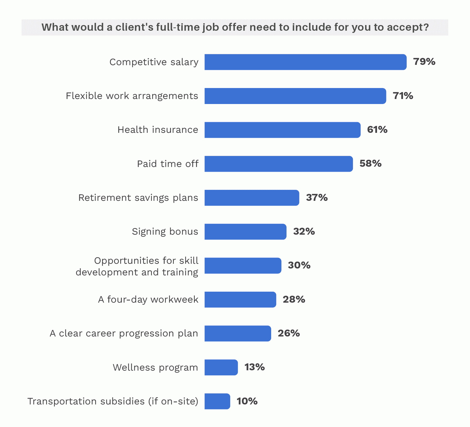 79% респондентов рассказали, что готовы перейти из фриланса на постоянную работу, если работодатель предложит им хорошую зарплату. Гибкий рабочий график считают достаточным основанием для смены вида занятости 71% опрошенных, а 61% на полную занятость может подтолкнуть медицинская страховка. Меньше всего фрилансеров соблазнились бы понятной перспективой карьерного роста (26%), велнес-программой (13%) и субсидированием транспортных расходов (10%).