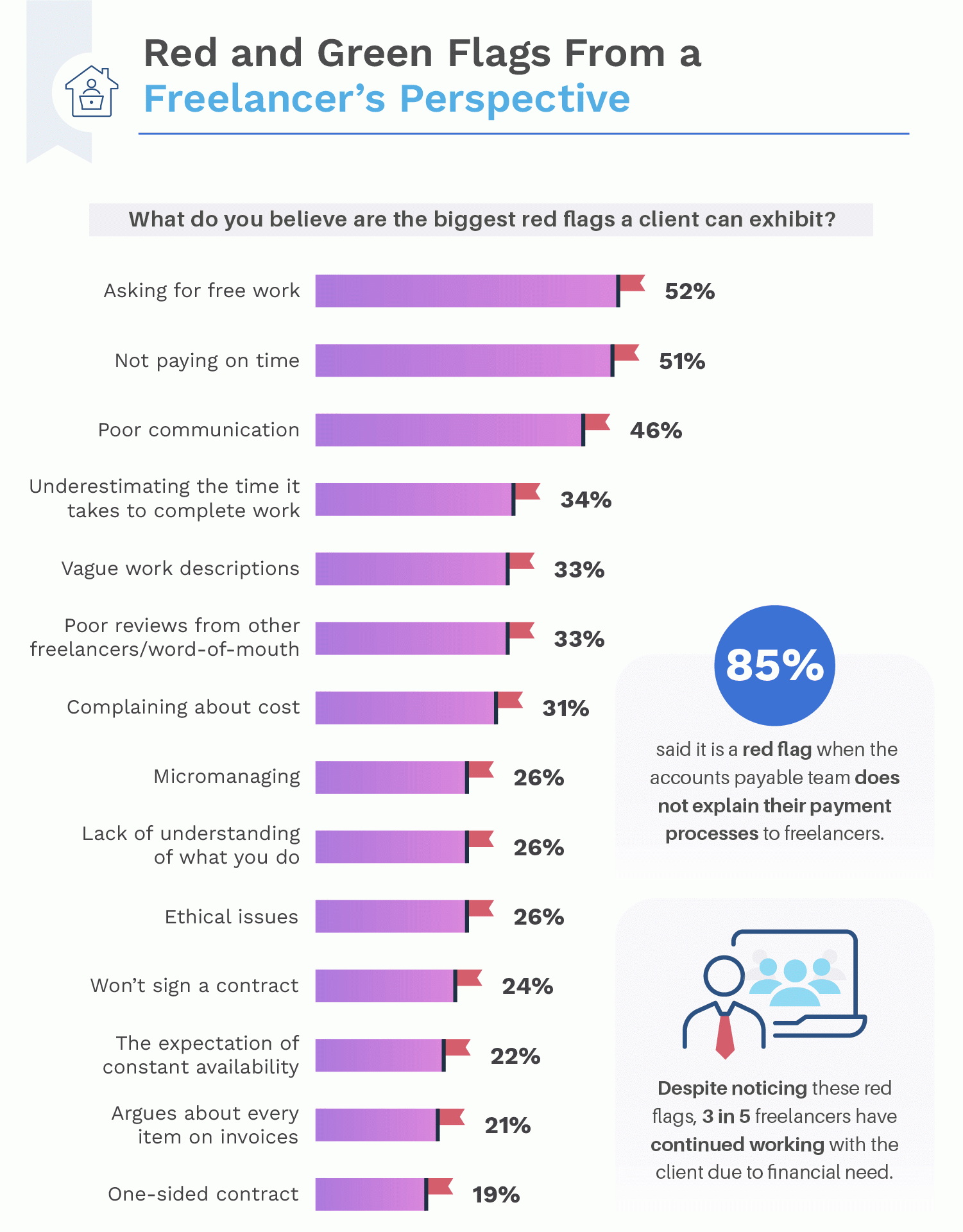 Просьба поработать бесплатно является, по мнению 52% фрилансеров, тревожным сигналом, отрицательно характеризующим клиента. 51% опрошенных настораживаются, если клиент не платит за работу вовремя. 46% не нравятся клиенты, с которыми сложно коммуницировать.