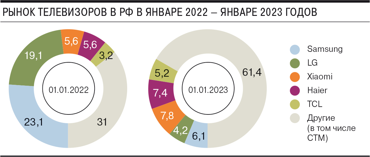 В первом квартале 2023 года продажи телевизоров в России выросли на 6,6%, до 1,55 млн штук. При этом в денежном выражении рынок телевизоров потерял 30%. Разнонаправленность двух показателей вызвана, с одной стороны, сокращением предложения южнокорейских брендов, ранее доминировавших на рынке, а, с другой, ростом продаж китайских и российских производителей, а также СТМ ритейлеров, которые торопятся освоить освободившуюся нишу. У СТМ, как правило, отсутствует наценка за бренд, они ориентированы на более дешевые модели, что снижает сумму среднего чека и выручку. По данным компании «F+ tech-Марвел» (крупнейший российский дистрибьютор IT-техники и электроники), в первом квартале 2023 года на долю СТМ-продукции в сегменте пришлось 22,6% проданных телевизоров — вдвое больше, чем годом ранее.