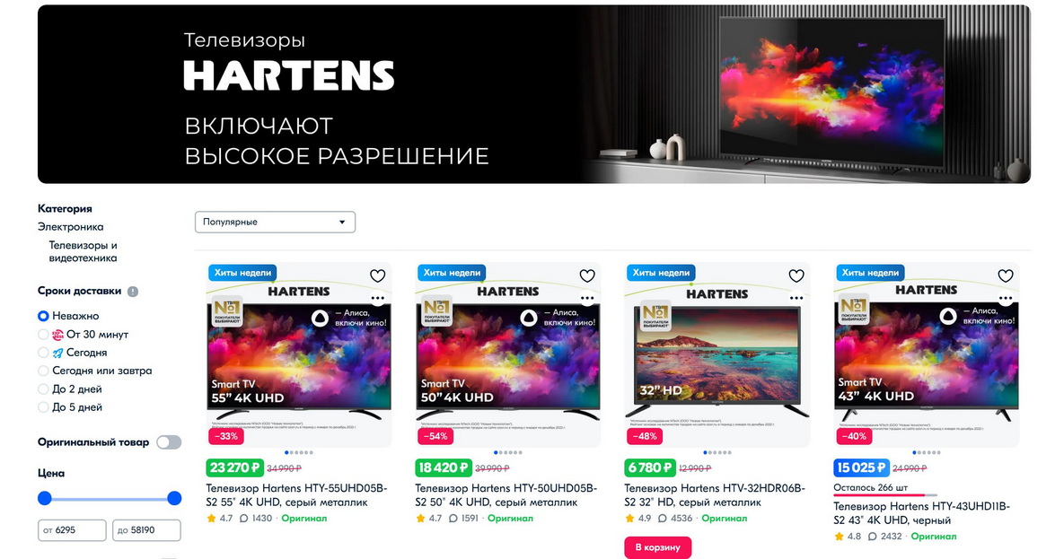 Особенно активно телевизоры под СТМ выпускают маркетплейсы, массово вышедшие на рынок бытовой электроники в 2022 году. Так, у Wildberries есть линейка телевизоров Razz, в которую входят шесть моделей с диагональю от 24 до 65 дюймов, а «Яндекс Маркет» предложил покупателям продукцию под маркой Tuvio (шесть моделей). Еще одним крупным игроком на рынке стал «Сбер», продающий телевизоры под маркой Sber. В модельной линейке бренда на данный момент 23 модели. Все они используют собственную операционную систему «Салют ТВ» и снабжены голосовым ассистентом.