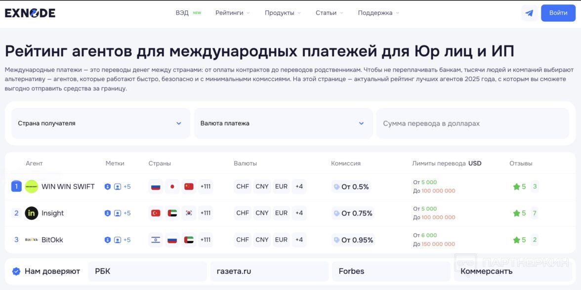 Среди проверенных агентов, которых легко найти на мониторинге Exnode, выделяются надежные сервисы, они позволяют компаниям оптимизировать бюджеты маркетинговых кампаний за счёт более выгодных курсов, прозрачных комиссий и отсутствия лишних задержек, которые характерны для традиционных банковских переводов.