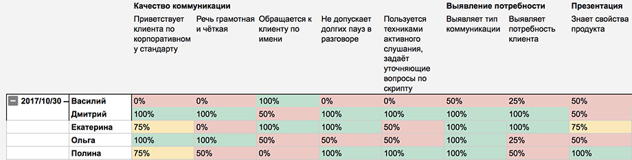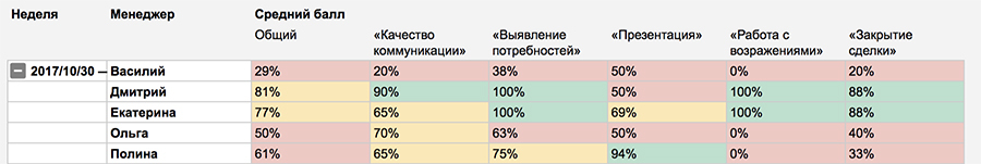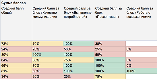 В этой таблице руководитель смотрит итоговые баллы в целом или по конкретным этапам разговора. Например, менеджер Екатерина в целом неплохо справляется: её итоговая оценка равна — 77 %. Однако у неё небольшие проблемы с качеством коммуникации и презентацией. Следовательно, руководителю стоит искать проблемы в этом блоке.