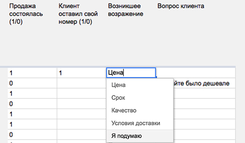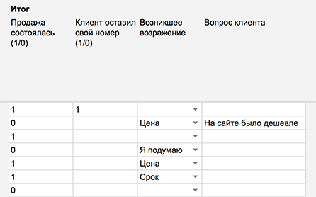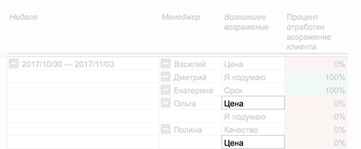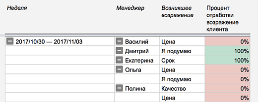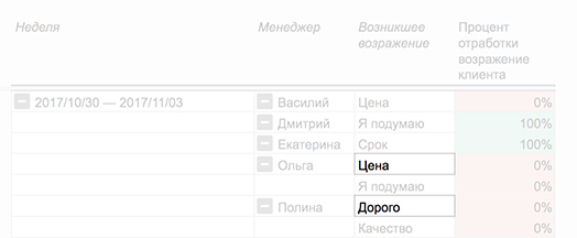 Важно, чтобы специалисты заполняли поля без оценки в едином формате. Если одно и то же возражение по цене записывать по-разному, например, «цена» и «дорого», таблица будет считать их как два разных.
