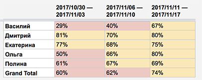Таблица показывает, помогает ли такое обучение. Если да, то с каждой неделей результаты менеджеров будут расти. В нашем примере видно, что результаты менеджера Василия выросли за две недели с 29 % до 67 % — значит, обучение помогло.