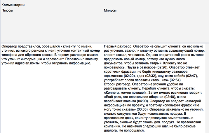 Оставляя комментарии, неопытные специалисты часто допускают одну и ту же ошибку: они пересказывают звонок. Это неправильно. В комментарии нужно описать ошибки менеджера и подкрепить их примерами непосредственно из звонка.
