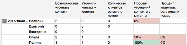 Если клиент сам позвонил, узнал нужную информацию и берёт время на подумать, менеджер должен спросить у него телефонный номер или электронную почту. Это нужно, чтобы напомнить о себе клиенту через некоторое время. В этой таблице видно, кто из менеджеров уточнил контакты клиента и насколько ему это удалось.