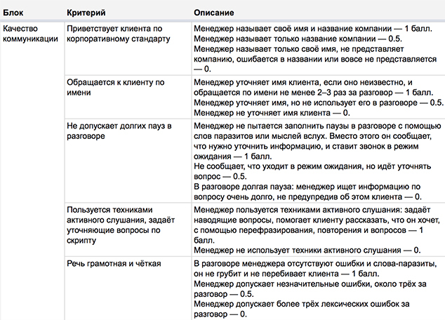 В таблице всегда есть критерий «Обращение по имени». Если его не расшифровать, один специалист будет понимать его как «узнать имя клиента», а другой — как «обратиться по имени несколько раз за разговор». В итоге по одному и тому же критерию у разных специалистов будет разная оценка.
